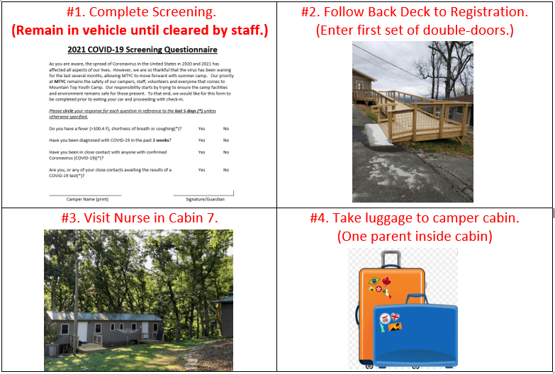 Each camper must fill out the 2021 COVID-19 Screening Questionnaire. You may print and fill out a copy prior to coming to camp or one will be provided on arrival.